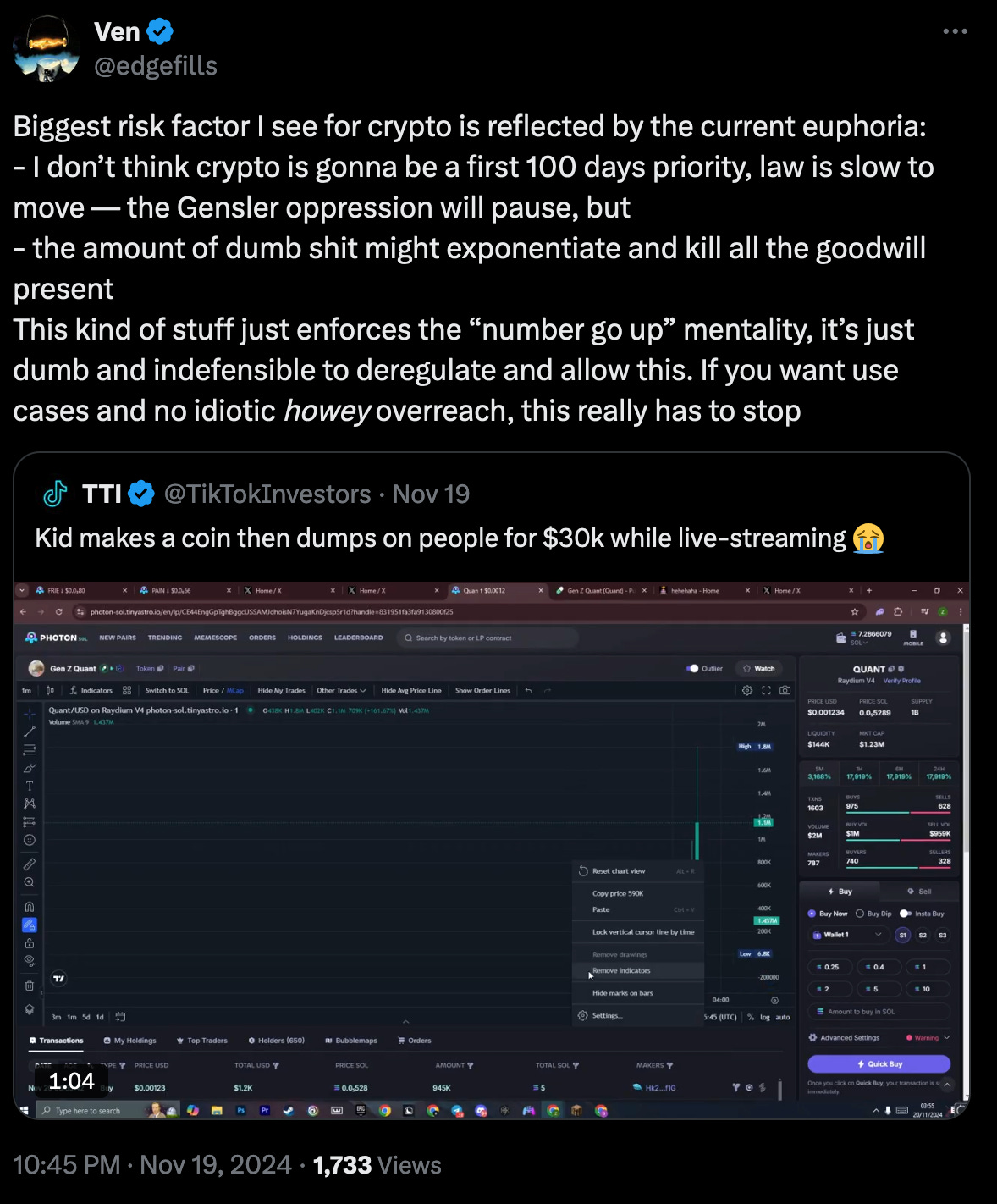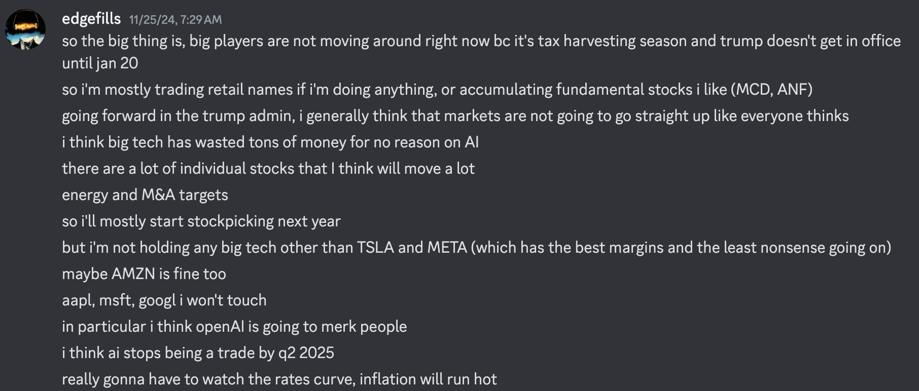 And if you’ve been following the pump.fun shenanigans, if that is what persists, it’s obvious no politician is going to stick their neck out for anything other than bitcoin — and what benefit does BTC get from dereg? It’s already gotten past regulators, there’s no more saturation other than the US government outright buying it, which doesn’t really make sense to me. There’s also the simple fact that tax optimization is “free alpha” — if you expect taxes to drop, then the entire EOY before inauguration would logically be spent maneuvering accordingly rather than building up sizable, fundamental positions, as I wrote in a message the other day: