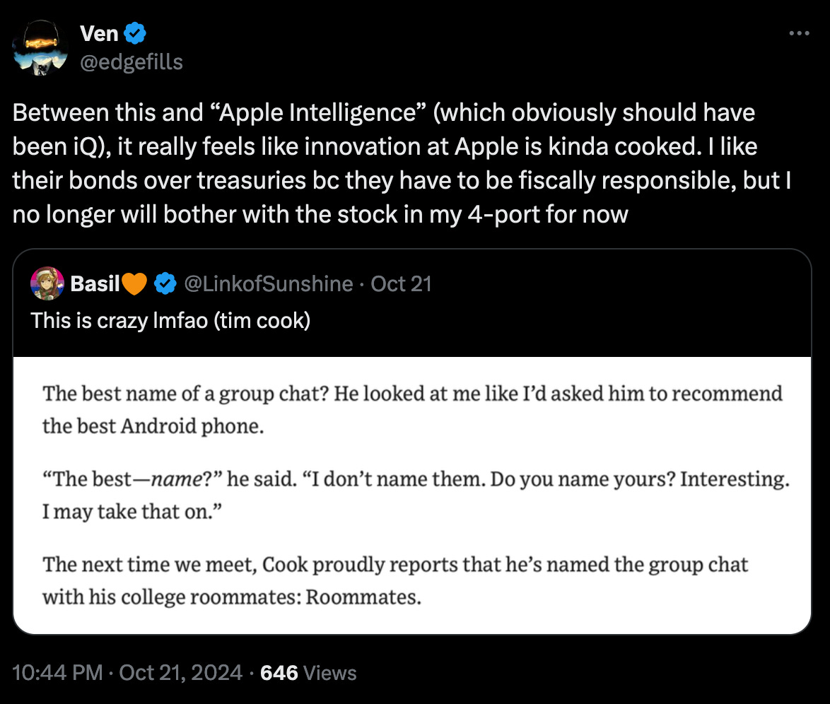 Going into 2025, however, this is the first time I’m not holding one of GOOGL, AAPL, or MSFT in 10 years. A strict regulatory environment only benefits the publicly traded CCP and the incumbents, but that is about to change. And when we take a closer look at what exactly has been driving these stocks upwards, is there any real explanation other than no other investment opportunity in the past few years had sufficient liquidity to consume? That we’re all trapped in the same trade, in a sense? All of these companies are incinerating money on AI, or, in Apple’s case, just bricking on innovation completely, and if there aren’t profitable deliverables hit by probably Q2, there are too many other places to seek a return at this point to justify just setting and forgetting big tech. (NVDA also critically relies on real products finally going to market and generating revenue — keep an eye on this one going forward.)