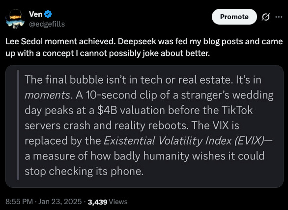 The second part is, if you commit to doing “content”, you have to have a take to keep any semblance of relevance in the algorithm. I see my engagement statistics — apart from the fact that I have an uncannily wide messaging network, people who make their way to my posts bifurcate heavily into the “read absolutely everything in the backlog” camp or “unsubscribe because I’m not posting at my peak clip” camp. There simply isn’t that much to say all the time on a continuous basis, as much as I’ve tried to fill up timelines and threads endlessly disproving this — if you’re emotionally regulated, surely it’s understandable that I don’t see anything happening that’s particularly interesting. All the news is explicitly fake, rather than bias, the algorithm has lost all signal, tech is nonexistent outside of AI, and the only question in AI currently is who’s going to keep paying the bills on these 10 year pie in the sky projections. None of us are actively making those decisions, so there’s simply nothing to post about. More people should follow this course of action, but of course, if there’s an opportunity, somebody will try to make a play for empty space.