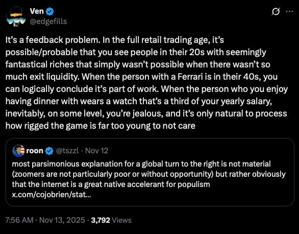 One of the great fictions of data and statistics is that a complex reality can be distilled to one number. It belies the fact that the people who are still buying out of school are now commuting an hour from urban sprawl, that own properties with none of the inherent build value of the pre-ZIRP years where people built things right, rather than to fit demand. You have to live outside of upwardly mobile, 1% areas to truly grasp how bleak the perspective on upwards mobility is. The heavily tread pathway does not work in the age of tech. Reality is fully bifurcated, the distributions don’t apply in normal ways anymore. The flaw of the internet, and tech, is not that it deprives zoomers of the opportunities that were never accessible to them anyway, but that they know exactly what it consists of. The Paris Hilton slippery slope of societal decline.