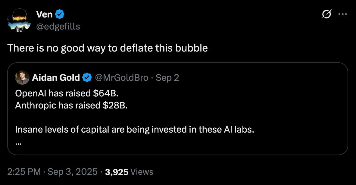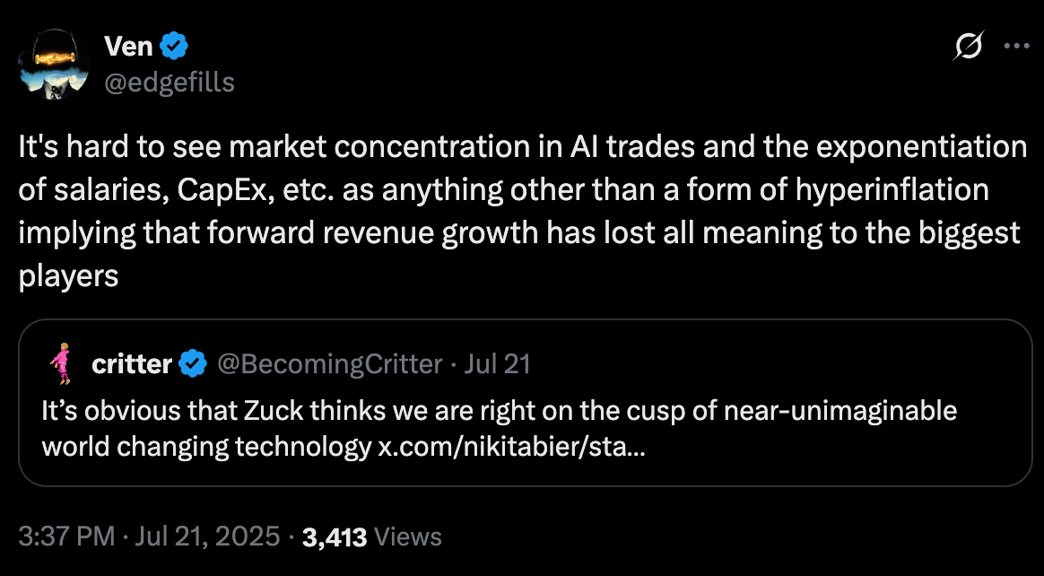 With the foundational model question, I don’t think anyone has truly asked what we can build with this model, and it’s become too costly to ignore the question. There is no way to generate “ad revenue” like the old web2 model of the internet, or “trading fees” like the web3 model of the internet, because the ad revenue is being funneled as capex to build these products. You can’t create a perpetual motion money machine without central bank printing, and that is not possible anymore.