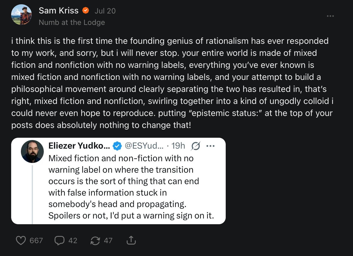 Anyway, a group of tech-adjacent readers picked up one of his posts and complained that “the fiction and nonfiction was not properly labeled”. To which Kriss responded by putting out this scathing takedown of the “rationalist” community, but can be summarized by one of his posts: