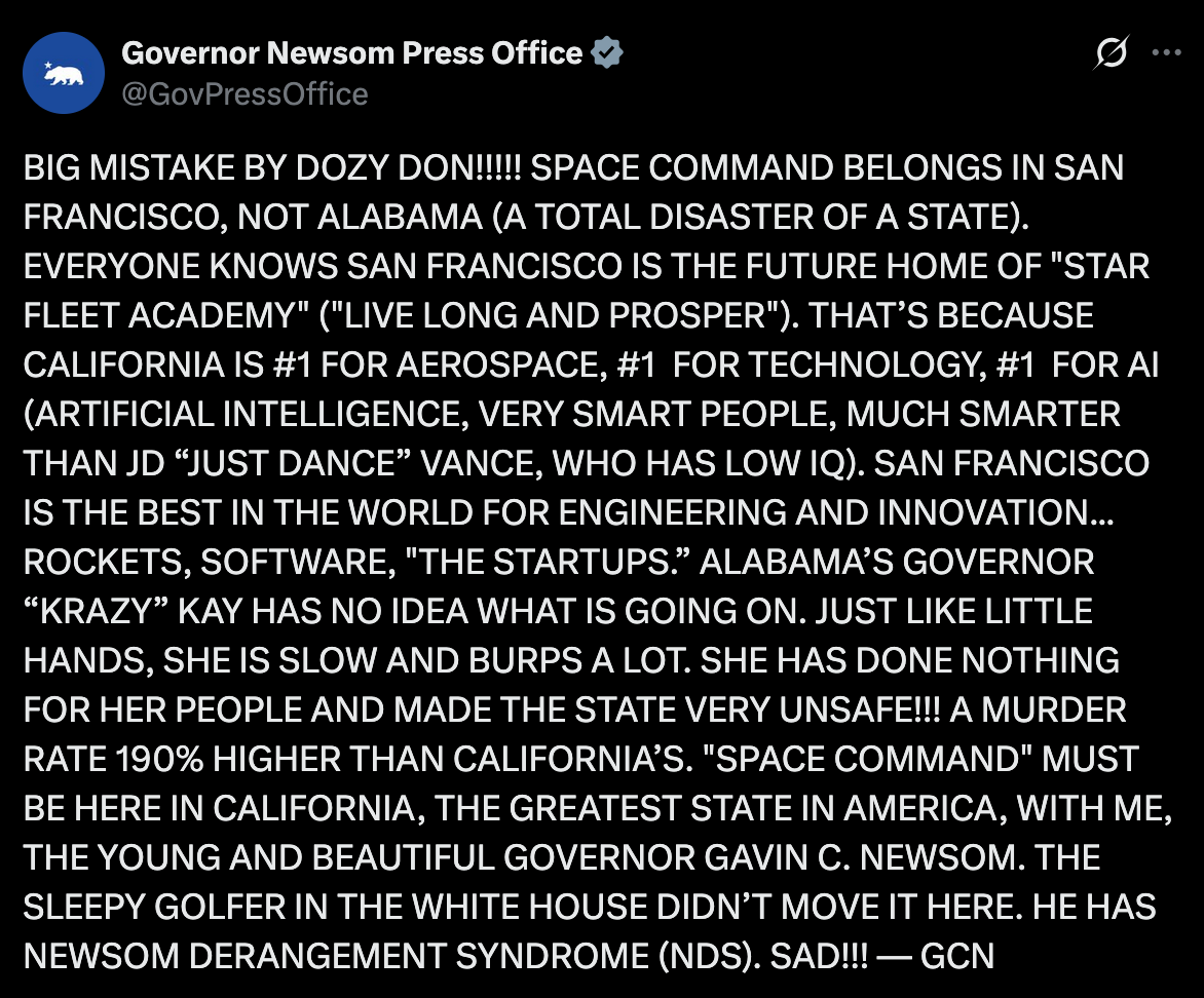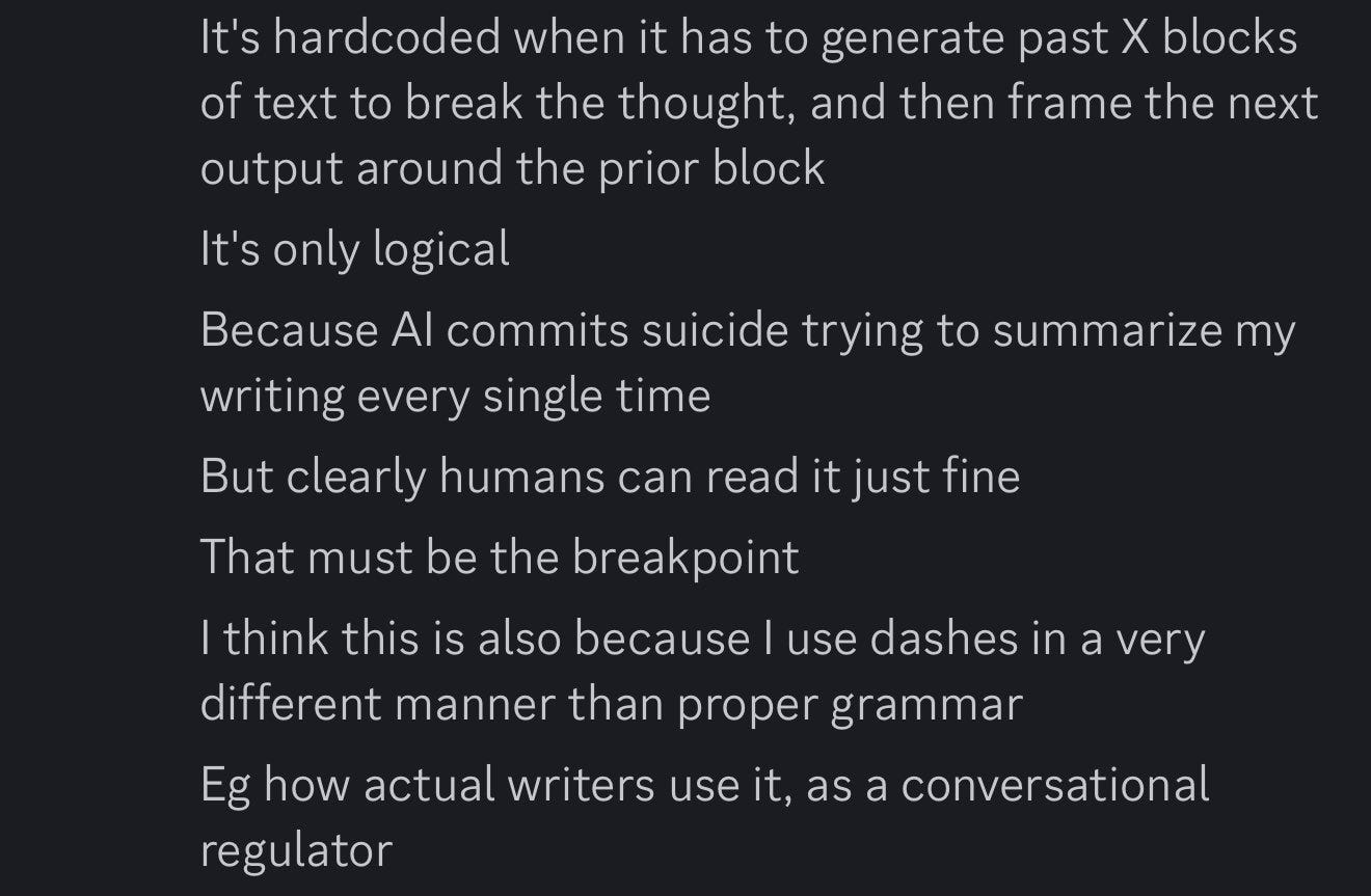Ignore the scent of desperation from an increasingly irrelevant politician and focus on the content for a second. A trick every good writer uses is simply reading things out loud. Whatever Temu AI model was used to generate this scrawl cannot account for cadence properly — it’s why you see a bunch of Trumpisms that have barely been translated but doesn’t have the natural feel of his rhythm. (Indeed, no matter your opinion of him, Trump’s sense of timing is better than the best comedians.) How LLMs try and correct this problem is by using em-dashes. I use them all the time, but it’s in a very conversational style — I like using them as breaks in sentences when I’m trying to redirect my thought. Hilariously, LLMs do the same thing, but in such an obvious, clinical fashion that it basically left the internet bereft of original content.