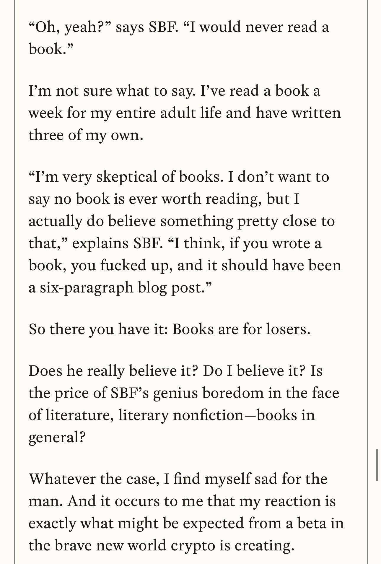 As I made my way through this discussion, I felt despair in a sense I can’t quite explain. I was reminded of that anecdote about how SBF refused to read a book