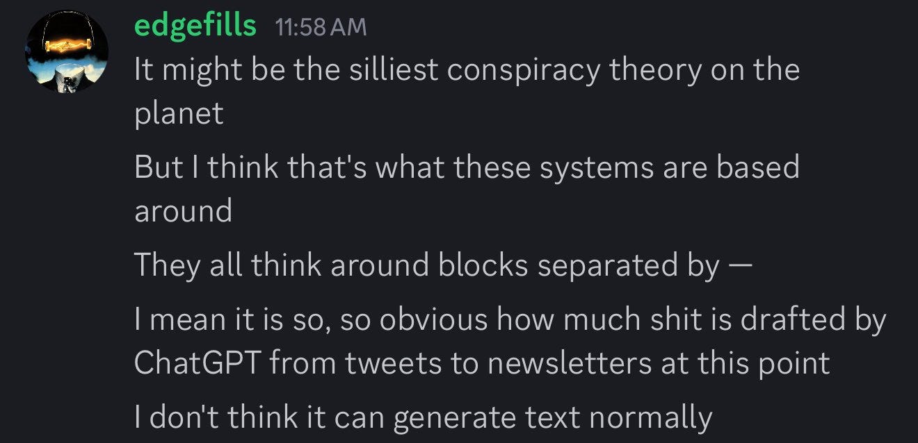 It’s not that SBF is, per say, wrong — it’s just that it’s right in the wrong direction. You don’t need endless amounts of training data, you need to realize that, no matter what, a ton of it is just pure junk. This is an esoteric judgment, you can’t quant this out or fine tune a model to do it for you. Quality sensitivity is a function of intuition, and downplaying this is denying the superpower of pattern recognition from minute amounts of data that the human brain possesses. There’s a famous story about Stephen Curry where, in the 2022 NBA finals, he noticed the rim was slightly too high during warmups because his shots weren’t going in. It’s just as true for someone like me who has probably read more in my 24 years of being literate than tens of millions of humans put together, maybe more. It’s so, so obvious when something is botted, astroturfed, poorly edited, copied and pasted, and inorganic that I’m shocked other people cannot see it: