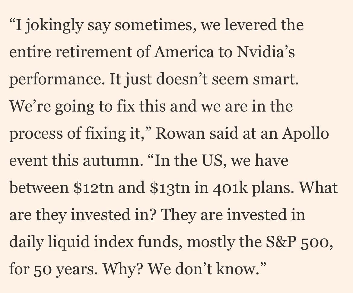 Value creation always depends on bubble mechanics, else you get capital creation for the sake of it. This one, though, is too big to handle. Combine this, the mostly passive state of capital markets, and you wonder, do "retirement funds" even really exist? Too many people are "rich" on paper with zero ability to allocate capital. This facade has to collapse somehow, but think back to the tariff drama — everyone is programmed to think they're "earning" this money. There's no growth mirage anymore, it’s just number-go-up for the sake of it.
