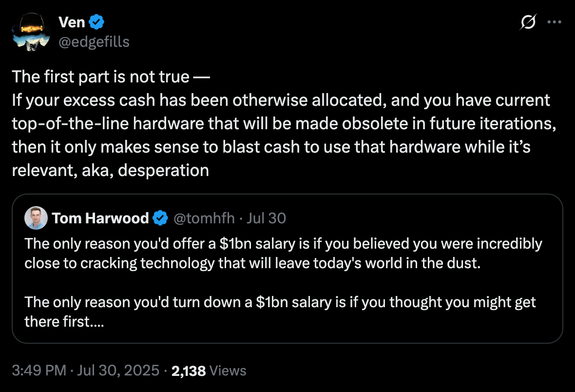 Do I think there’s substance to Meta’s bet? Of course, but the only read I have from this is that they’ve cornered an expiring GPU market and have nothing useful to do with it.